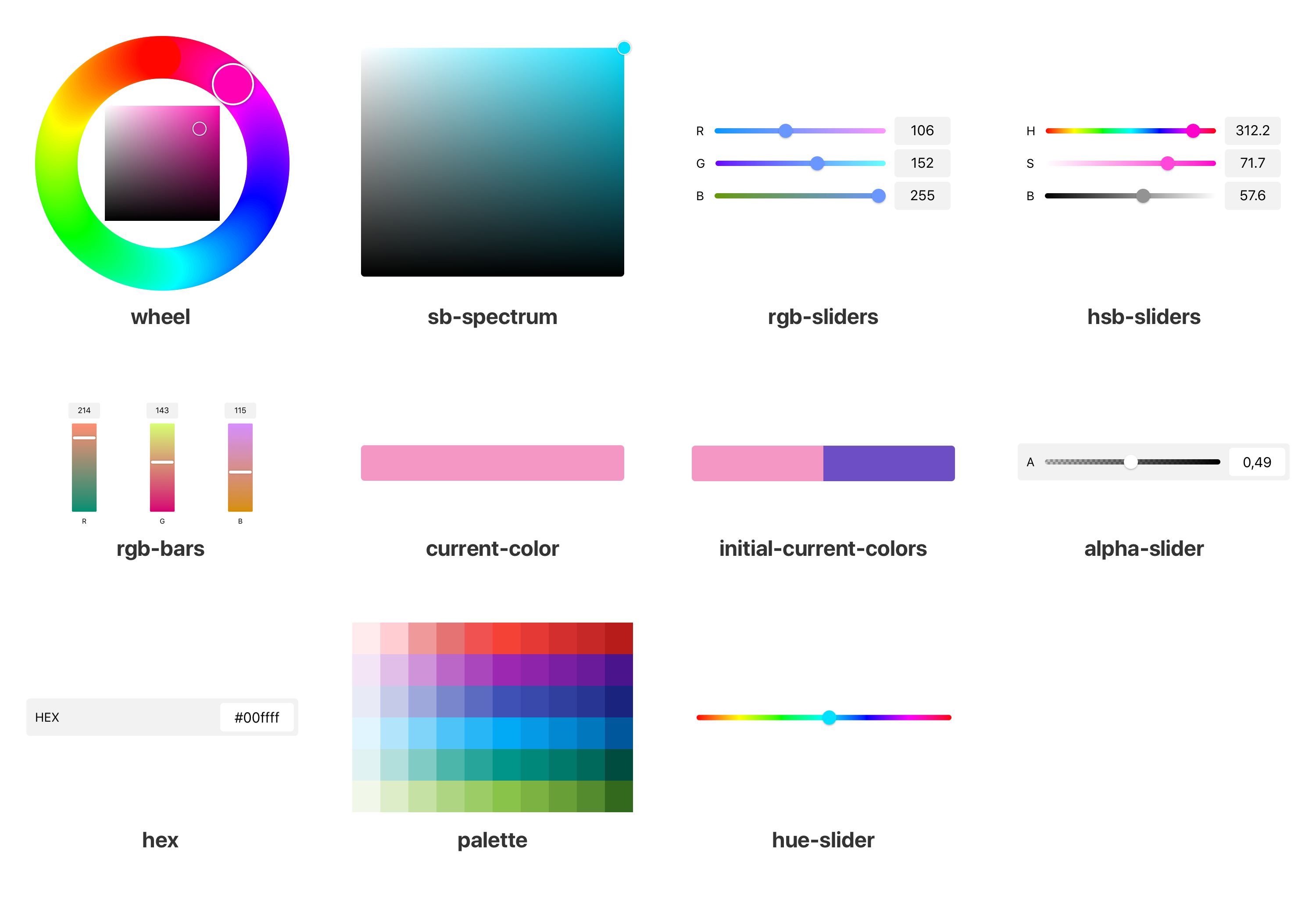 And you can create color pickers with any combinations of these modules. Here is the demo from Kitchen Sink: