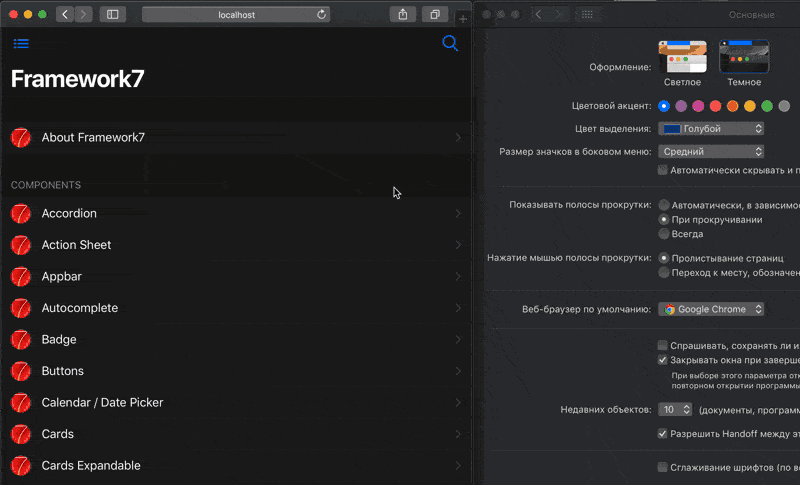 Now Framework7 can automatically enable/disable dark theme based on user system color scheme preference. This feature is based on prefers-color-scheme media query, which is not widely supported yet, but already implemented in latest versions of Safari and FireFox, and coming to Chrome in upcoming versions.