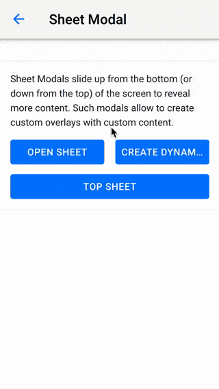 By default sheet modal opens from the bottom of the screen. Now it is also possible to open it from the top of the screen. In this case we just need to add sheet-modal-top class to sheet element.